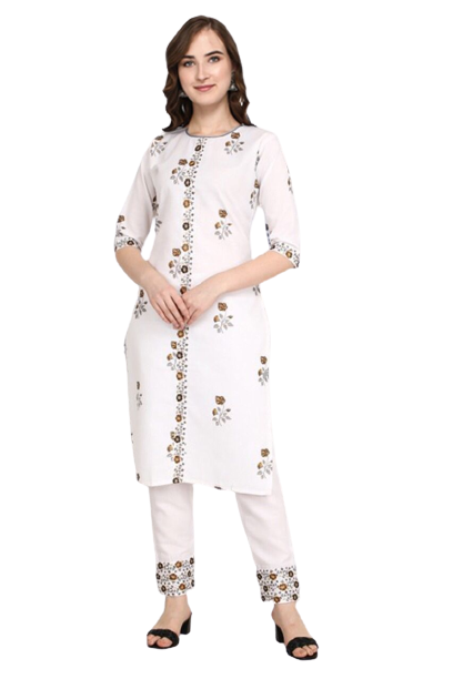 Ethnic design solid colour pure cotton heavy slub fabric Kurti with minimal embroidered work on the centre front and solid colour and foil floral print across the Kurti; paired with straight cut narrow fit ankle length pure cotton pants with embroidered floral border.
