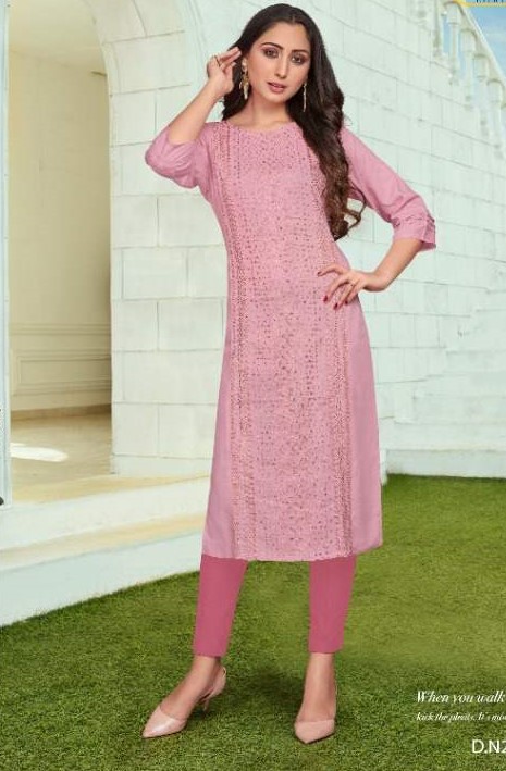 Single solid light coloured fancy wear pure soft rayon kurti with embroidery and embelishments on bodice part upto the helmline, to give the ethnic touch. Perfect choice for your casual wear collection