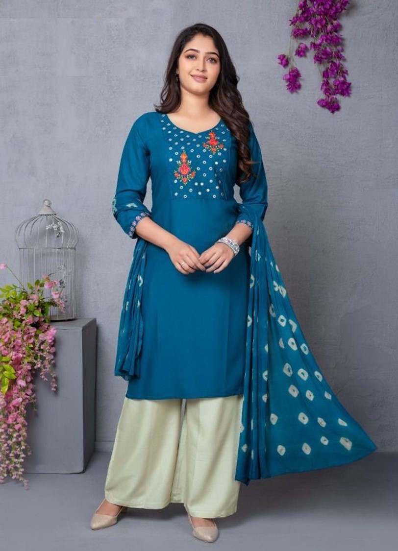 Soft Rayon Single Coloured Kurti with mirror embroidery work, plain rayon Palazzo and Nazneen Bandhani print Dupatta