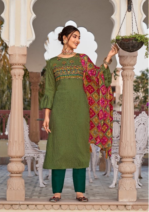 Ethnic richness unveiled with our viscose feather touch Kurti/Kameez embellished with Kutchhi mirror work and Khatli handwork, paired with heavy muslin salwar pants and highlight with chiffon Bandhej Print Crushed Dupatta designed specific for your unique stunning look